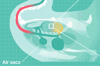 As part of their respiratory system, phoenixes have nine air sacs that work together with their lungs. Unlike the lungs, however, these air sacs are not directly involved in the exchange of gases. They allow for air to flow unidirectionally through the lungs. This means that the air flowing through their lungs is mostly fresh air and will thus contain more oxygen that can diffuse into their blood. The air sacs also allow the lungs of phoenixes to take in oxygen during both inhalation and exhalation. Altogether, phoenixes have a highly efficient lung structure that allows them to have enough oxygen for physically demanding activities like flight and to breathe at high altitudes.
